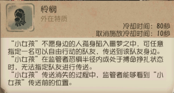 “小女孩”的【回忆碎片】也是可以打断监管者的【传送】和【失常】(但【失常】被打断并不会进入冷却时间),在特定时间打断监管者的辅助特质,可以影响整场对局节奏。