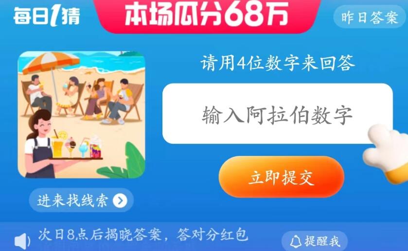 请用4位数字来回答?淘宝大赢家每日一猜7月5日的最新问题当中玩家需要请用4位数字来回答图中的内容,答对就能够获得奖励,那么每日一猜7月6日的答案是什么呢?今天小编为玩家们带来的是7月6日的问题及答案,还不了解的小伙伴可以来到这里看一看。