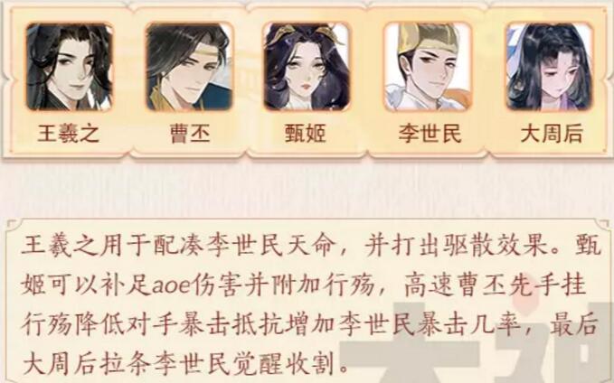 王羲之的整体面板为良好以上,多段的aoe使王羲之既可以专堆输出套灵器用于输出,又可以装上辅助灵器用于打控制。阵容优先搭配李世民可触发天命.