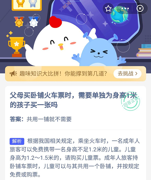 以上就是关于父母买卧铺火车票时,需要单独为身高1米的孩子买一张吗?这个问题的正确答案,获取正确答案的小伙伴们,可以去领取属于自己的小鸡饲料了,明天也会持续为你更新的哦。