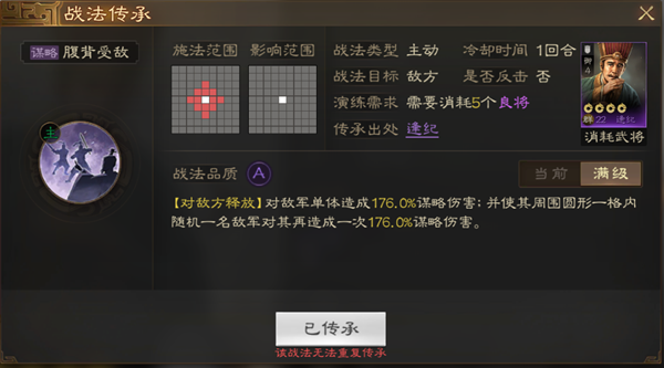 战法简介:很不错的伤害战法 总体谋略伤害能达到接近400 金色武将拆取战法也没有这个数值。
