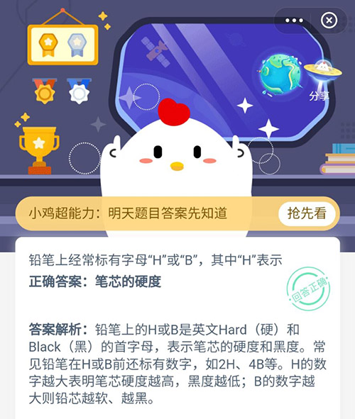 生活中经常可以看见铅笔标有字母H或者是B,但是你知道这些字母都表示着什么吗?今天支付宝蚂蚁庄园中的小鸡答题就问到大家这样的问题,其中铅笔上的H表示着什么?赶紧和小编一起来看看正确答案吧。