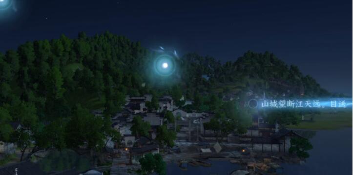 2、玩家跟随镜头看到远处的山脉以山为意象写出一句词山城望断江天远。目送一,船愁又到。