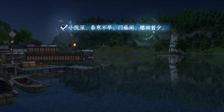 4、玩家将镜头转到江边渔船,以渔船为意象写出第三句词小院深、春寒不早。门昼闲、堪回首少。