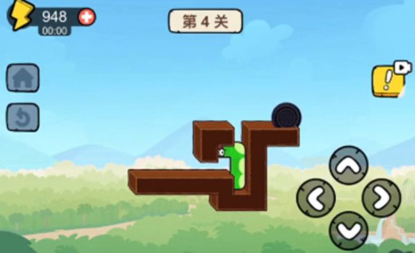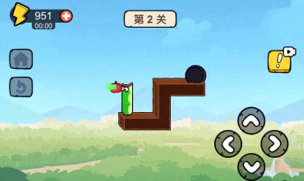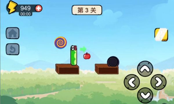 向右,头抵到边缘之后向上直立,向右吃到苹果变长了就不会掉落,向下一关大门前进。