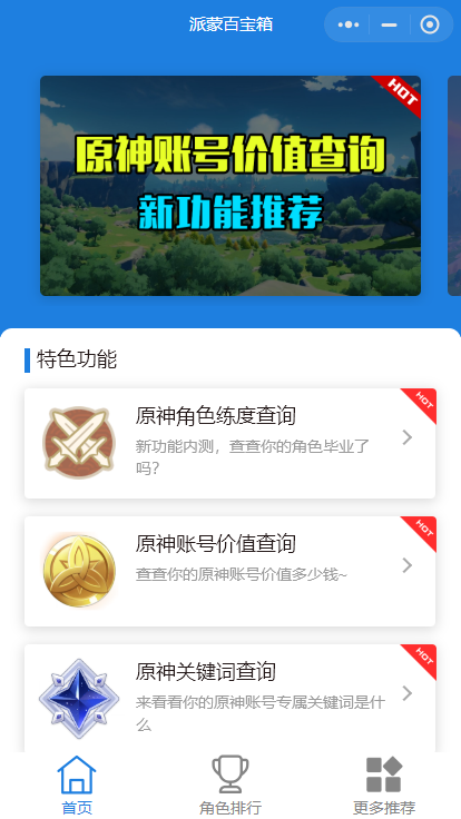 通过微信小程序查询,可以直接搜派蒙百宝箱,进入微信公众号。
