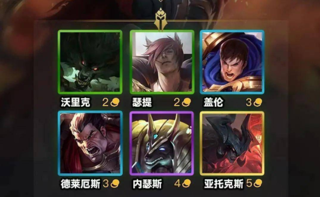 1、羁绊弈子:沃里克、瑟提、盖伦、德莱厄斯、内瑟斯、亚托克斯