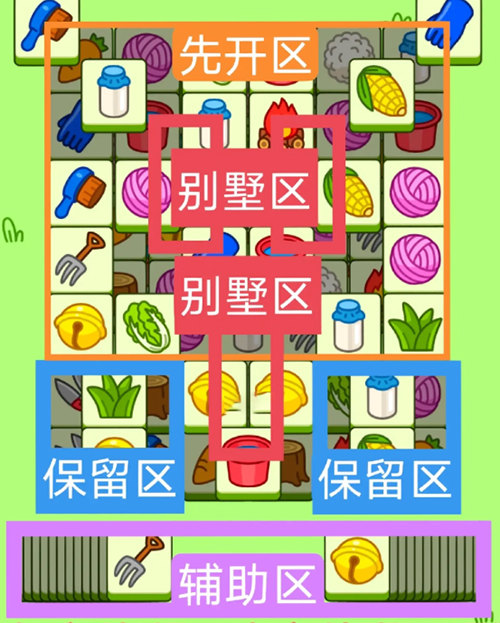 3.必要时可以用紫色盲盒区辅助消除,盲盒区后期不用留太多,留几张备用即可。