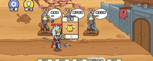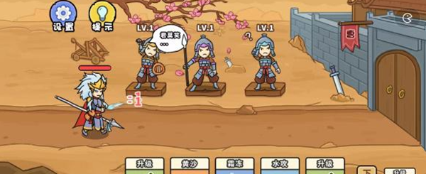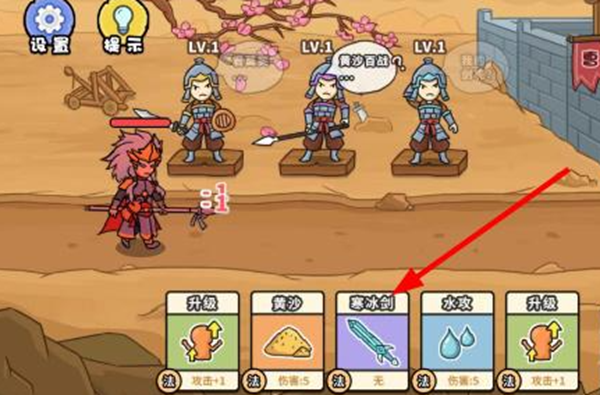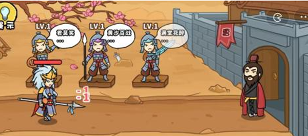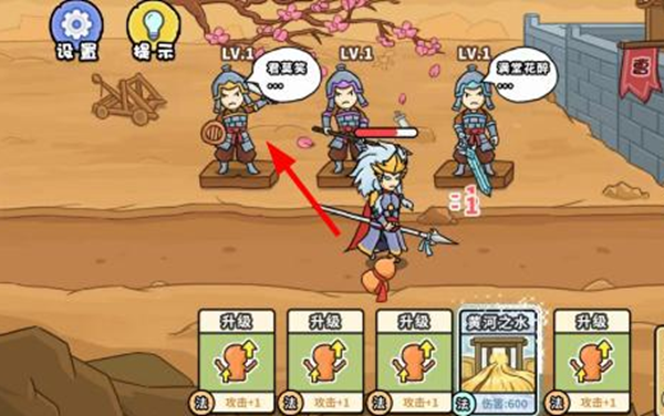 3、接着我们把寒冰剑给第三个没武器的将士,再点击后面的桃花,然后点击城门上的旗子,这时曹操会出来。