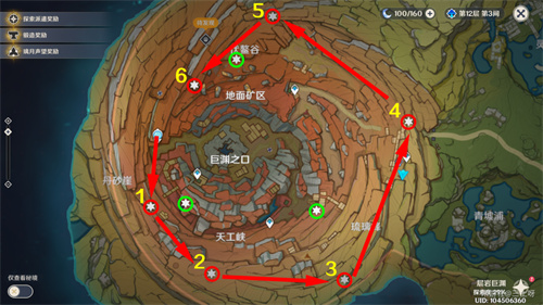 其中三个在磐键旁边(绿圈),剩下四个都在悬崖上(红圈),按下图顺序,传送到神像那里前往一号老石,然后按逆时针一圈,沿着悬崖走,就能集齐全部老石