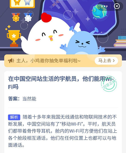 以上就是关于在中国空间站生活的宇航员,他们能用Wi-Fi吗?这个问题的正确答案,知道答案的小伙伴赶紧去领取自己的小鸡饲料吧。