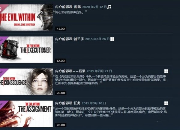 答:The Evil Within-Soundtrack、The Evil Within: The Executioner、The Evil Within-The Consequence、The Evil Within: The Assignment