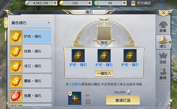 高级魂石能够给玩家属性带来一定的增幅效果,不过要说属性上面加成最多的非黄色魂石莫属了。黄色魂石能够给玩家带来一定属性上10%的增幅,还不带 套装上面的增幅。不过其打造的方法相对于蓝色魂石困难了许多,是需要在蓝色魂石的基础上,加上一些游戏材料才能打造,其中有一样是需要花费一定的元宝才能 够打造成功的。对于土豪玩家来说,哪怕你能够买得到元宝材料,相应的高级魂石也要自己一步一步的去合成。