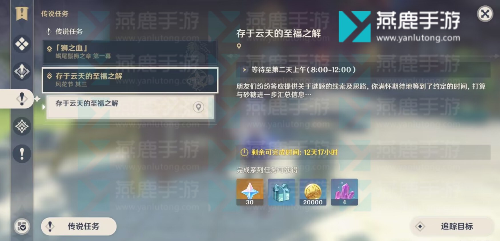 1、接到任务[存于云天的至福之解],调整游戏时间至两天后8-12点。
