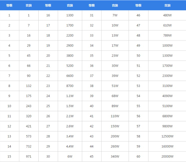 51级=1700W、52级=2300W、53级=310W、54级=409W、55级=510W、56级=680W、57级=980W、58级=1250W、59级=1600W、60级=2000W。