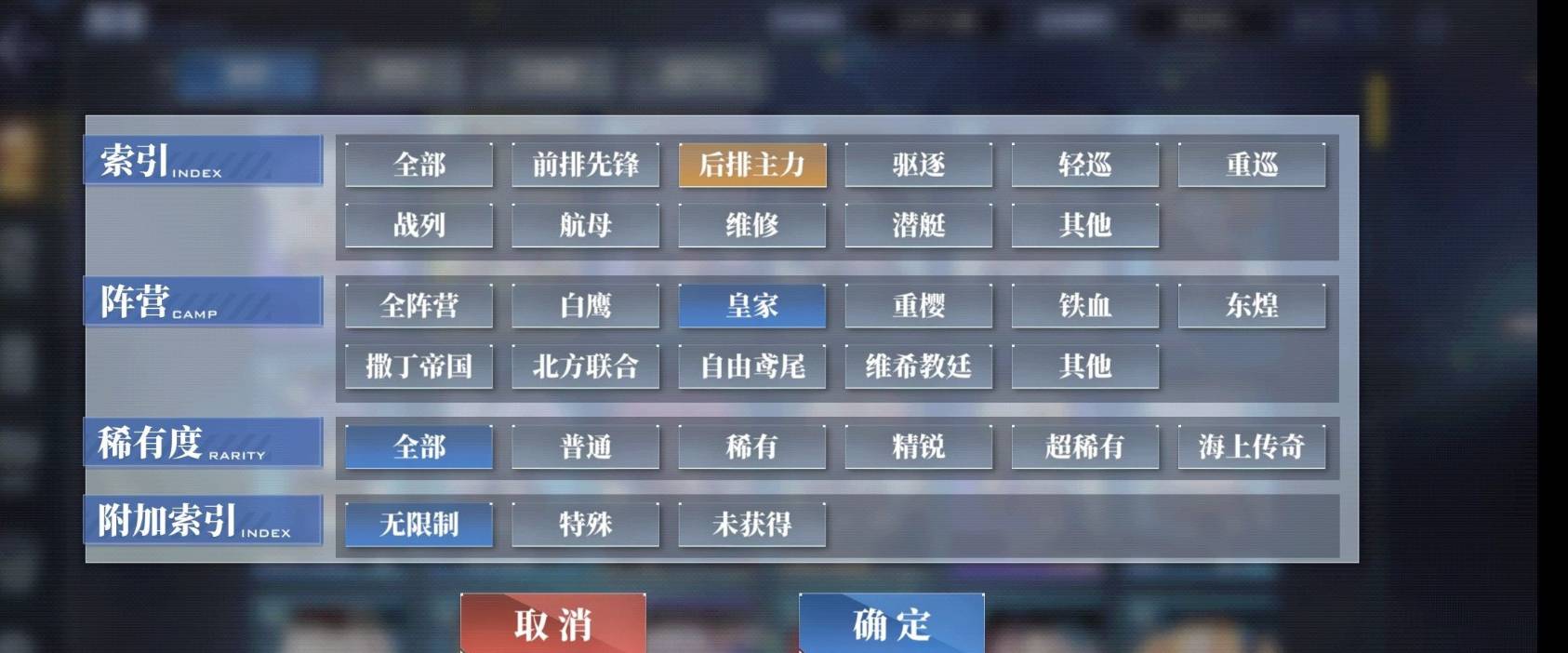 4、在里面点击筛选词“皇家主力”和”后排“