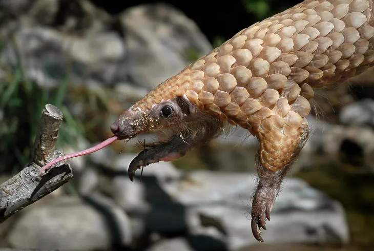 穿山甲主要是用舌头来捕食的,它舌头细长且能伸缩,舌头上带有粘性唾液。主要以蚂蚁为食,将舌头伸出放在地面上,等蚂蚁爬满舌头后将舌头缩回去吃掉,将鳞片张开使蚂蚁爬满身躯,钻到水中,使蚂蚁出来然后用舌头舔食掉。