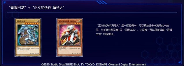 召唤「正义的伙伴 海马人」,解放自身,发动效果,能从手牌中特殊召唤「青眼白龙」!快速地召唤出强力怪兽,以高强攻击力压倒对手吧!