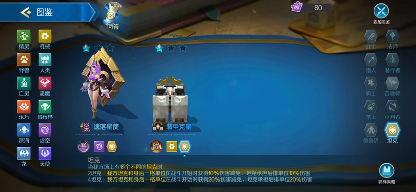 2坦克:我方坦克和身后一格的英雄在战斗开始时获得10%的伤害减免,坦克承担后排10%的伤害。