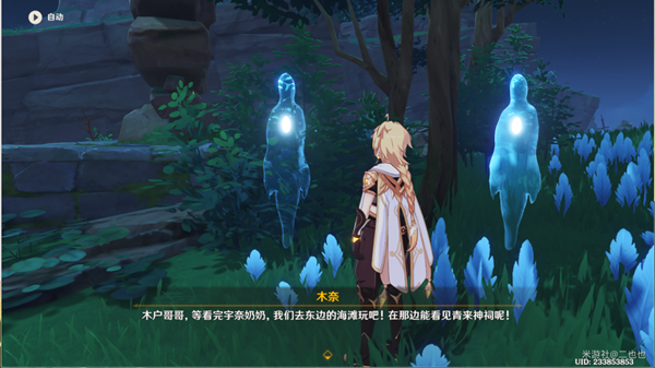 木奈与木户对话,前往看宇奈奶奶,然后去东边的海滩玩,可以看见千来神祠