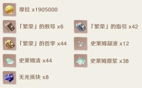 7级:摩拉12w、繁荣的哲学4、史莱姆原浆4、无光质块1