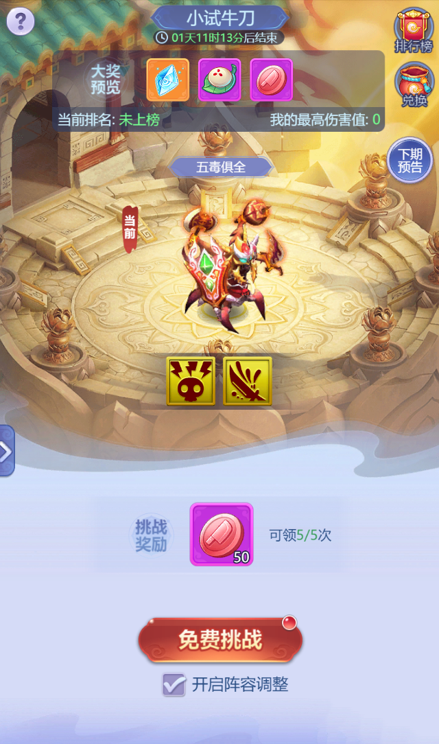 此次牛刀核心思路:优先考虑用新伙伴-孙思邈,其他可以上火队或者你目前最强力的推图伙伴,没孙思邈可以用忘川童子+太乙真人,如果第一回合小怪打的是忘川童子,且太乙真人恰好保护忘川童子,那么第一回合就全部存活,接着太乙真人再保护其他输出伙伴即可完成伤害最大化。
