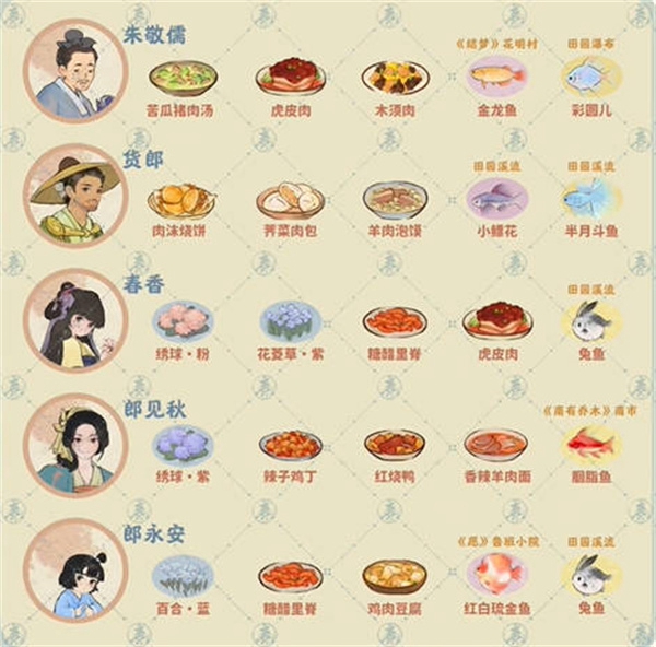 在桃源深处有人家中村子里的每个村民都有其各自不同的喜好,我们给村民送出他们喜欢的食物的话有概率可以领取到支线任务,那么村民们的喜好都是怎样的呢,今天小编就把村民的喜好汇总分享给大家,一起来了解一下吧。