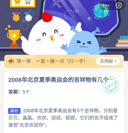 在2008年的时候,关于夏季奥运会的吉祥物有几个,小伙伴们都知道关于2008年北京奥运会中出现的吉祥物有几个,今天的支付宝蚂蚁庄园的问题就更好的为你提供,想知道这个问题的正确答案吗?赶紧一起来看看吧。