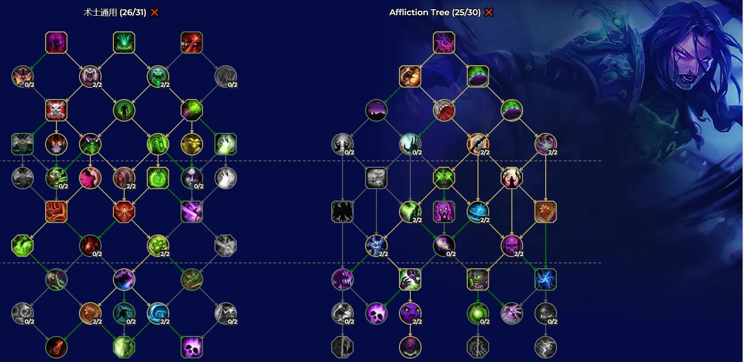 由于前夕等级只有60级,因此通用天赋树只有26点、专精天赋树只有25点天赋可用。加点如下图: