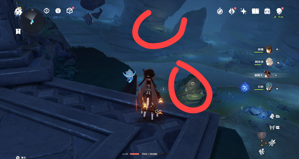 2、然后贴着左边瀑布一直飞,就会看到一个枯木的平台。
