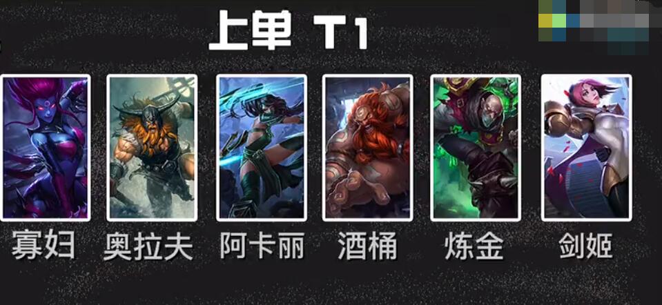 一、上单T1梯队:寡妇、奥拉夫、阿卡丽、酒桶、炼金、剑姬