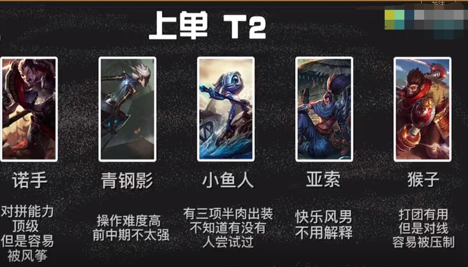 二、上单T2梯队:诺手、青钢影、小鱼人、亚索、猴子