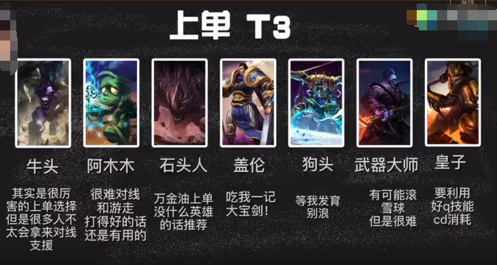 三、上单T3梯队:牛头、阿木木、石头人、盖伦、狗头、武器大师、皇子