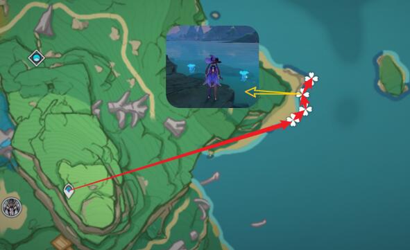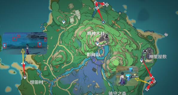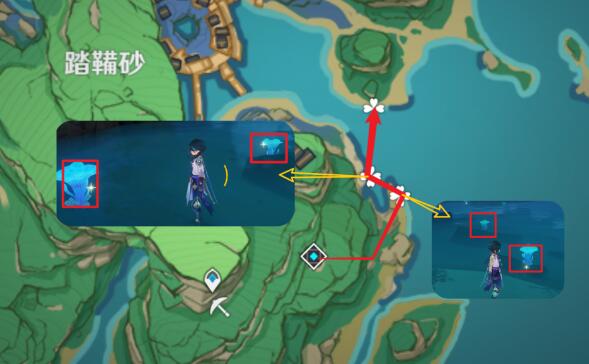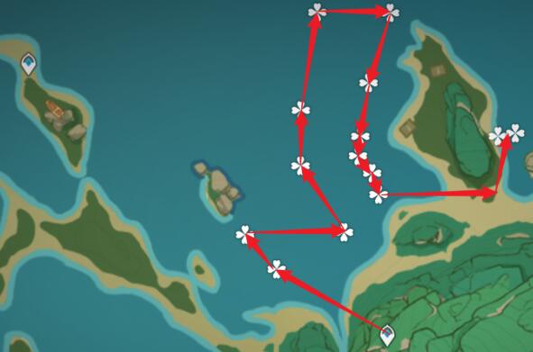 上方线路部分需游泳采集,适合有神里和莫娜的旅行者食用,无两个角色的旅行者可食用下方线路。