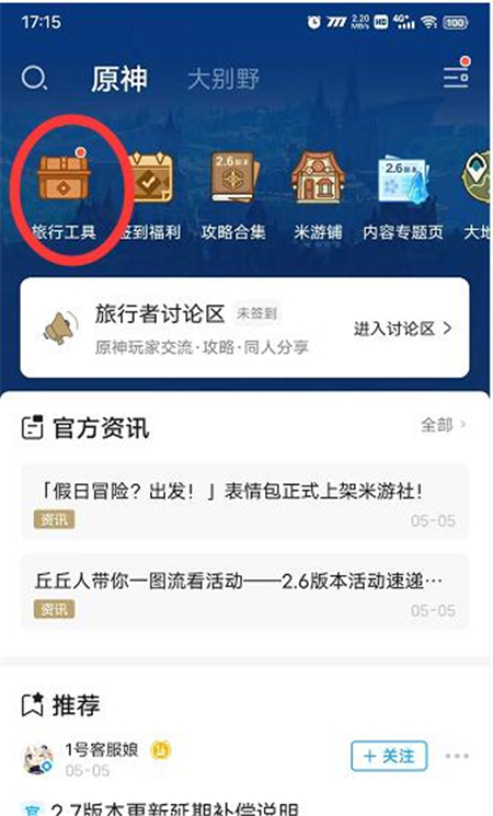 1、首先我们打开米游社APP,点击上面的旅行工具。