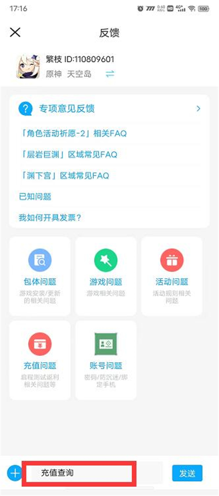 3、在输入框里面输入【充值查询】