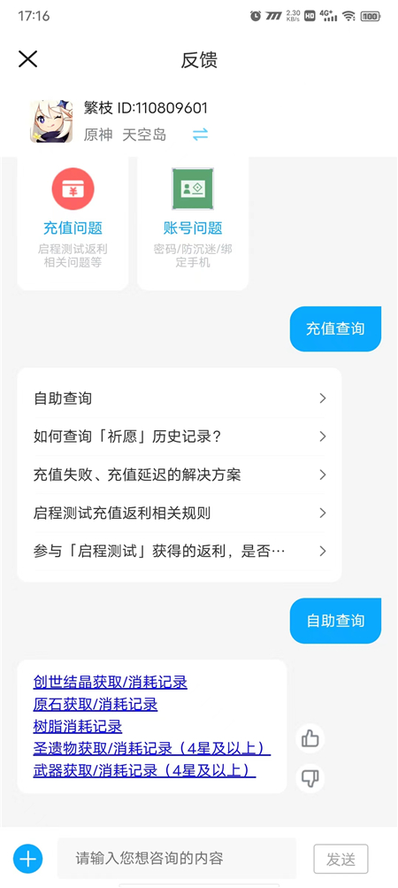 4、然后点击上面的自助查询,即可查到氪金信息。
