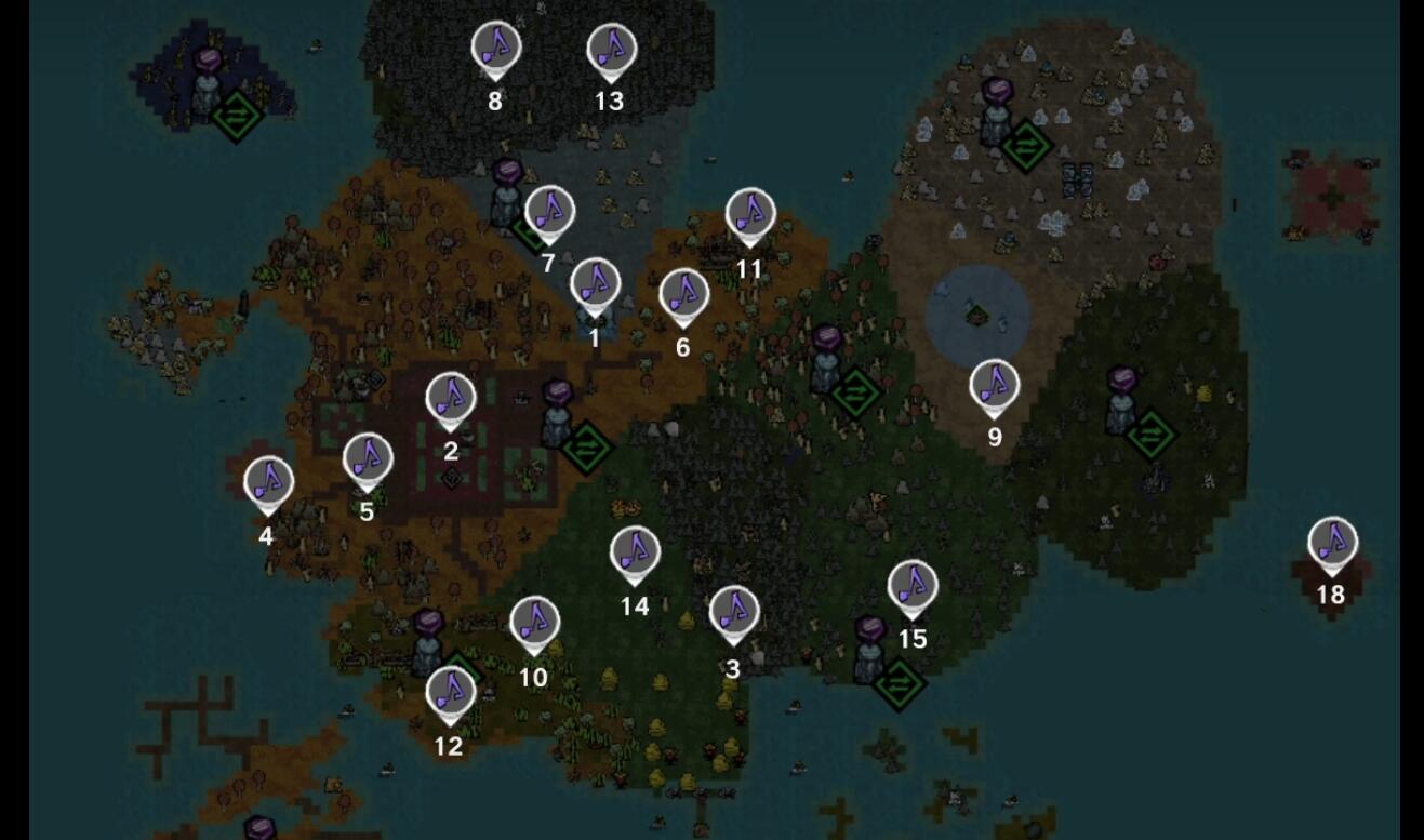 以上就是饥荒新家园浣熊世界的十八个音符的位置了,大家根据小编整理的位置就可以在浣猫广场的传送点、平原的传送点、桦树林的传送点等位置当中找到。
