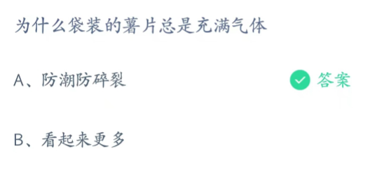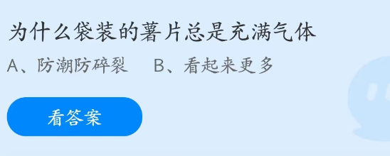 2023年2月10日的蚂蚁庄园小课堂其中一个问题是:为什么袋装的薯片总是充满气体?大家可能会不太了解这个问题的答案,那么这个问题的答案究竟是什么呢?现在就为大家提供了答案,一起来看看吧。