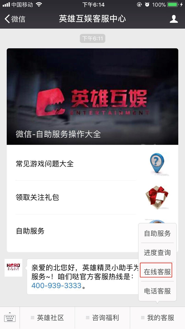 4、除了官网,玩家还可以通过关注英雄互娱官方微信号:英雄互娱客服中心,随后选着右下角我的客服中的在线客服可以在线沟通问题。