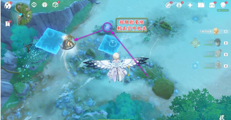 2、拾取旁边的能量块,射击空中的机关。