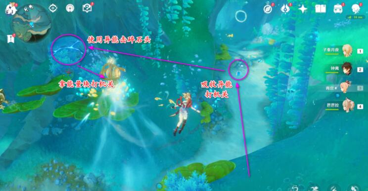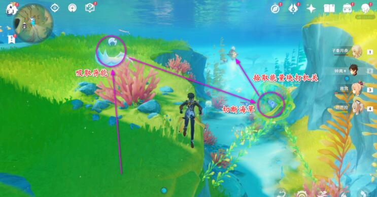 2、吸取异能,切断海草,拾取能量块,射击空中装置,击败出现的魔物。