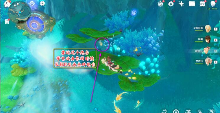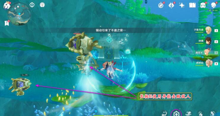 3、长按E使用异能快速击败敌人靠近下面那个炮台,等它攻击时,长按E反击,击碎炮台即可。