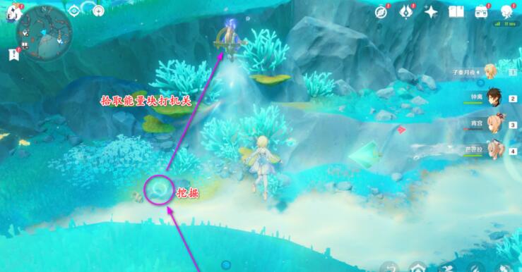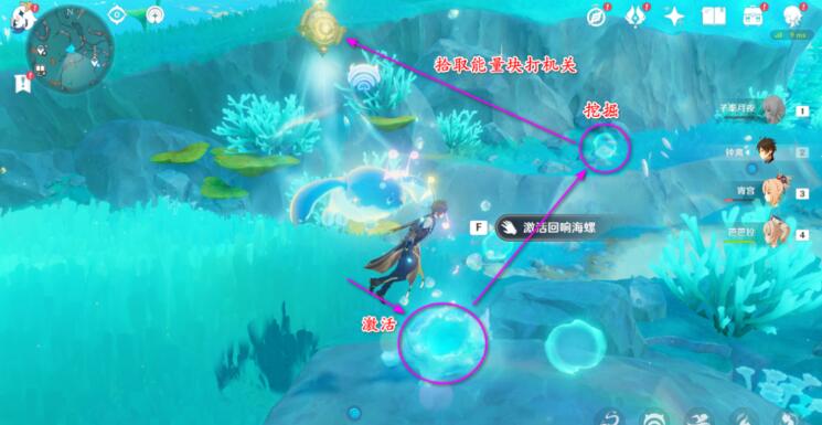 4、再次激活回响海螺,到那边挖掘,拾取能量块,射击空中装置。
