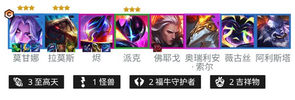 2、阵容羁绊:3至高天+2福牛守护者+2吉祥物+1怪兽。
