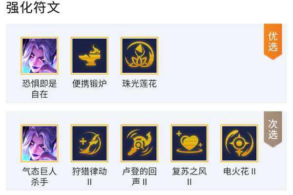 怪兽至高莫甘娜这套阵容首选强化符文是莫甘娜的【恐惧即是自在】,有了这个强化之后阵容的强度可以直接提升一个档次,注意尽量选择战斗力的强化,选择经济类的强化的话可能会导致我们的阵容战斗力不足。