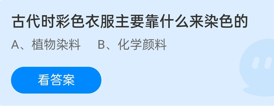 蚂蚁庄园小课堂12月29日的其中一个问题是:古代时彩色衣服主要靠什么来染色的?相信很多小伙伴也不清楚,下面一起来看一下蚂蚁庄园12月29日的正确答案吧。
