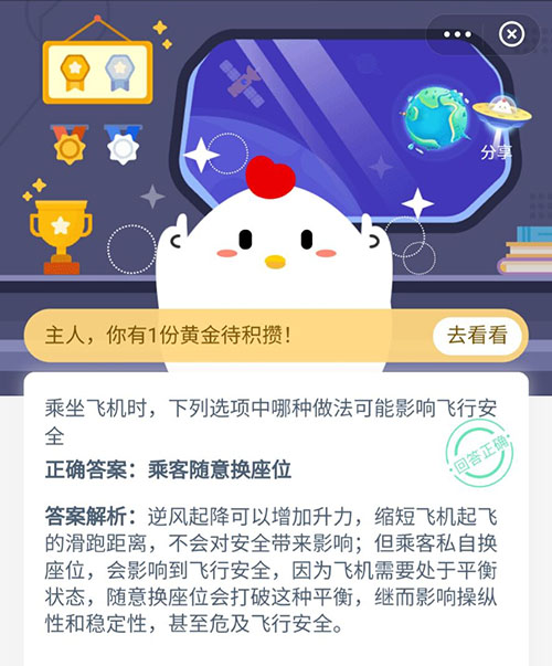 在日常生活中乘坐飞机也有更多需要小伙伴注意的地方,在今天的支付宝小鸡答题中就问到这样一个问题,以下哪种做法在乘坐飞机时影响飞行安全,一共有两个选项哦,赶紧和小编一起来看看正确答案吧。
