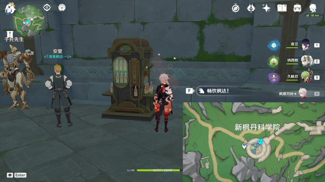 1、首先先来到新枫丹科学院,到达之后需来到东北边的饮料机这里并与之进行交互;
