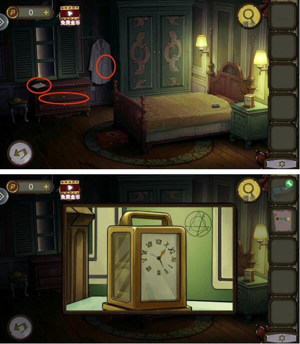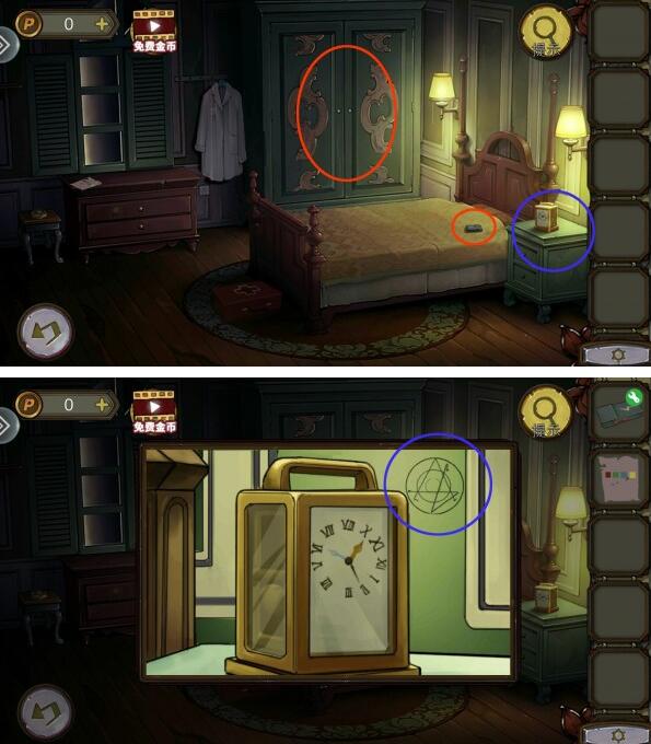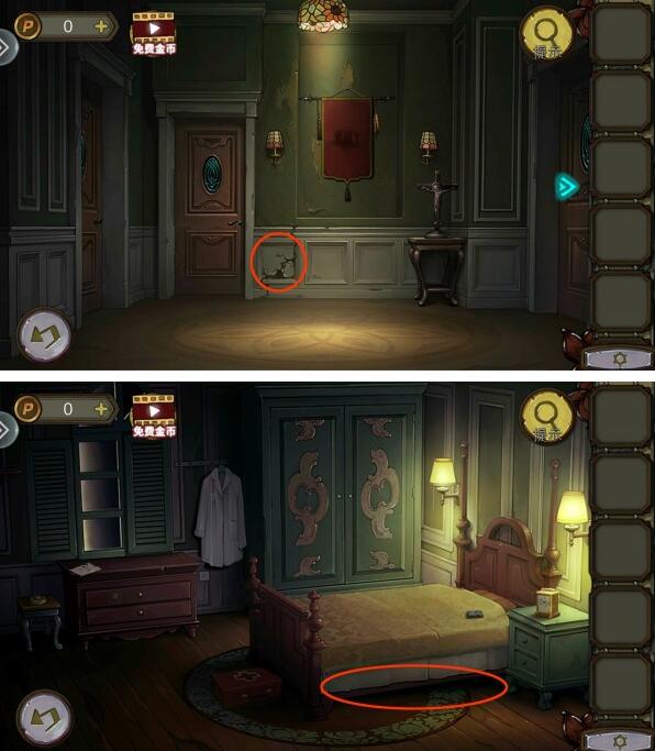 6、最后我们调节时间:10:30,在楼梯口破墙中,使用锤子获得磁铁。用磁铁在右侧房间床下即可获得钥匙。